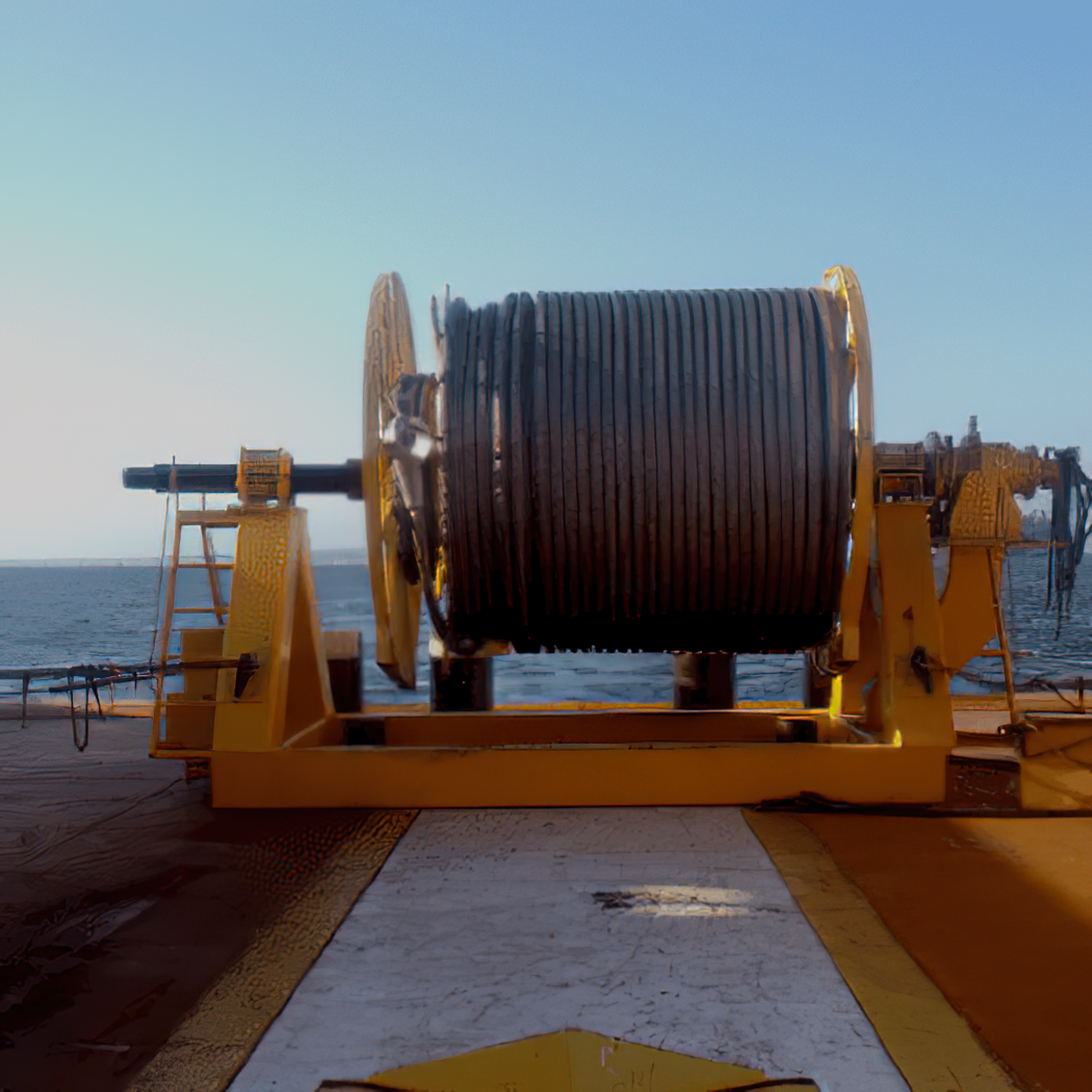Dispomos de bobinadeiras hidráulicas (a diesel) com capacidade de carga de 15t a 80t (e até 10t de tracionamento) para realizar serviços de troca de cabos de embarcações e guindastes, entre outros, e de inspeções de cabos de grandes comprimentos. A passagem dos cabos entre os guinchos de embarcações ou equipamentos e as nossas bobinadeiras é realizada pela nossa equipe.